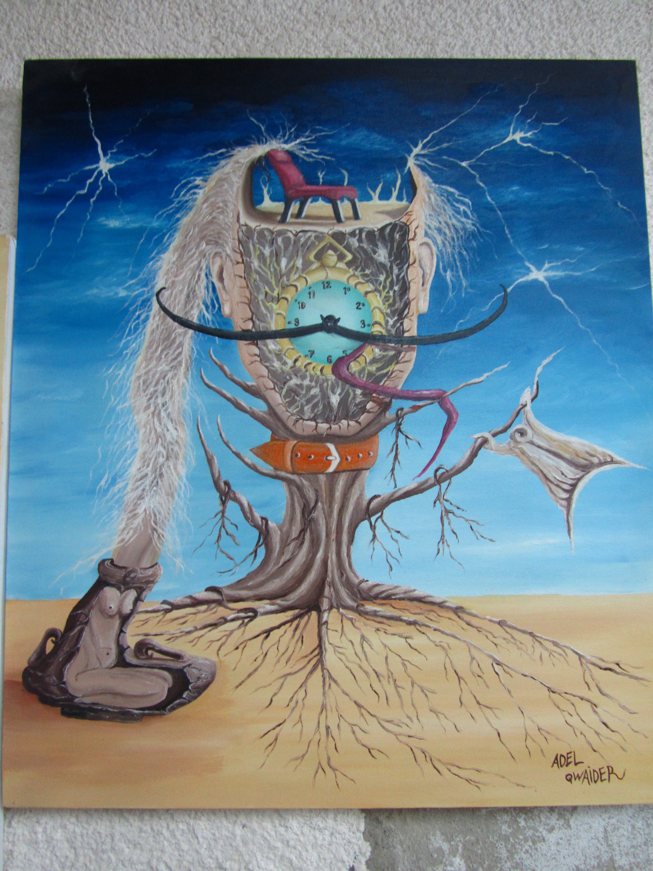 In this sense, in order for a work to remain as a surrealist challenge to the established order, social or political, in order to destroy conventional meaning or create a counter-meaning, which means counter-discourse on negotiated reality, must it present an absurd construction? When once the juxtaposition of Lautreamont’s suggested beauty would have been taken as an absurd proposition it is now far easier to accept. Magritte’s challenge, ceci n’est pas une pipe (This is not a pipe) expressed in La trahison des images (The Treachery of Images), would not resonate the same now as when it was first introduced into the collective experience-this challenge to the accepted order is now taken for granted- just as one cannot adequately retrace one’s steps through an ancient city center, preserving the full emotional affect of the first experience. In this light one is left to wonder whether modern surrealist paintings are devoid of the shocking potential to challenge political or social conventions due to their reliance on a now established structure of forms. It would appear however, that while Qwaider’s pieces are obviously no competitors for those of Magritte’s first insistence that we reexamine our ideologies and psychic constructions of validity they present a symbolic confrontation to the reigning order of subjectifying ‘reality,’ a ‘reality’ which under Ben Ali was taboo to represent or question.