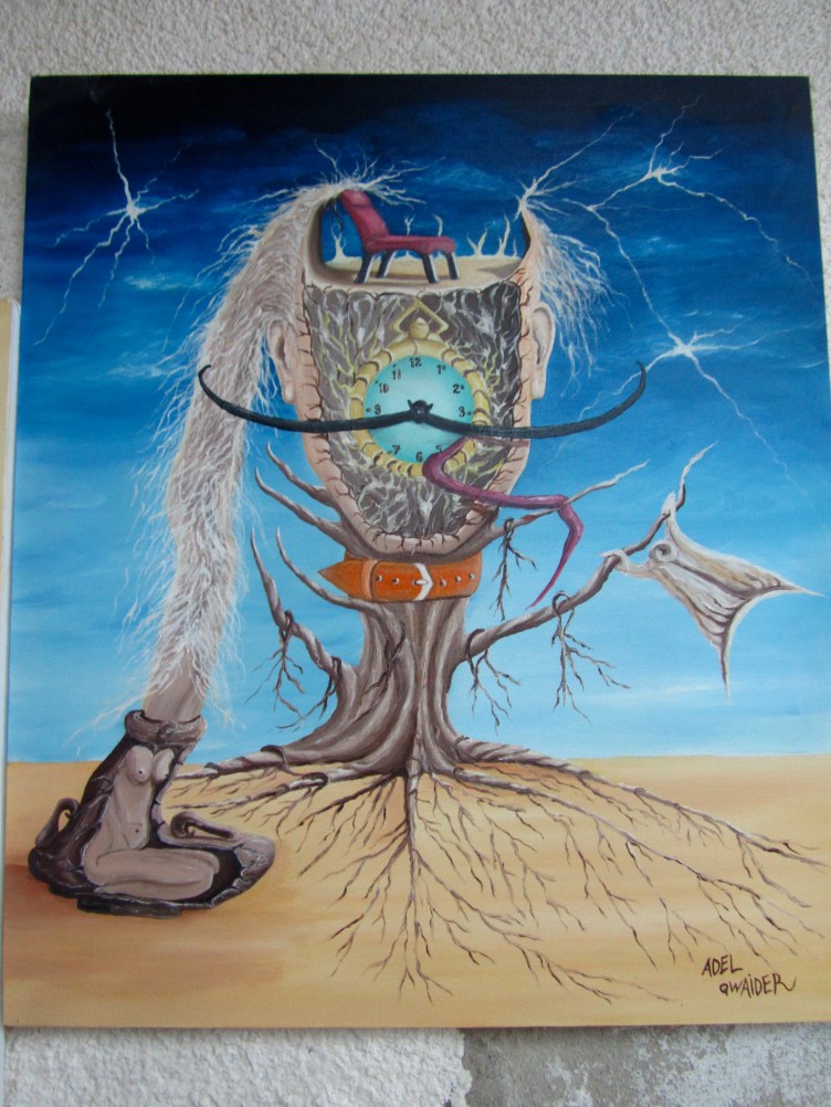 He gestured to a painting of a faceless man sitting behind a desk, the juxtaposition of the material perspective of the man, the artist, in front of me, behind a desk, the stranger-essentially faceless, pointing to the pictorial man, the image, the object to my left of an inscribed faceless creature in the same posture, perhaps encouraging his unseen interlocutor to glance outside the confines of the painted image to notice another pair of observers. The man behind the desk in the image was naked. On the desk, near his right and left hands were two masks, each ostensibly a different archetype, ideology, characteristic. “People lie,” Qwaider commented when he noticed my attention focused on this work. While this piece had the feeling of an unrefined Magritte the bulk of Qwaider’s pieces were glaringly redolent of Salvador Dali.