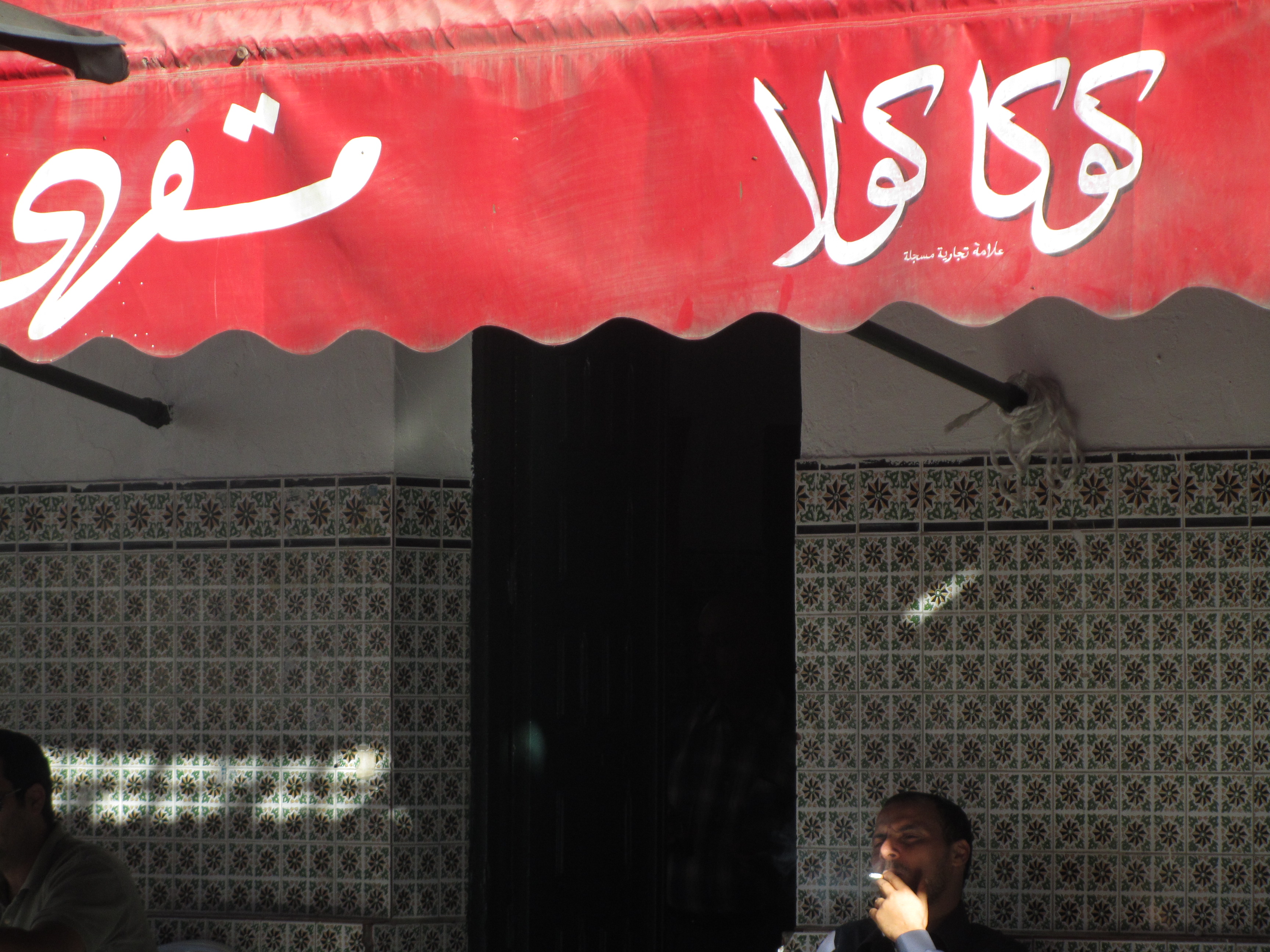 At the back of the tent of the cafe, around a table with a large glass bottle of Safia water, two empty glasses, and a third glass that bears the leaf of what once contained thé menthe, sit two heavyset men in their thirties. The larger of the two sits backward in his chair. His large belly inside a taupe shirt presses into the back slats of his white plastic chair creating an antiquated convicts’ pattern of black and white. He faces out, out of the cave of the cafe. His companion sits into the table, with one leg protruding to his left. As they sit their silent to each other they momentarily greet passing familiar faces with waves, winks, and other gestures, once or twice calling out a name or greeting until one comes up to join them.